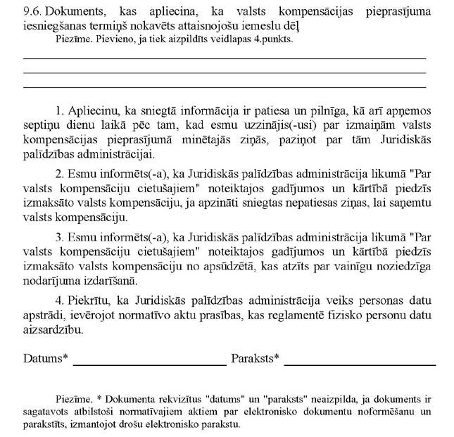 1. Noteikumi nosaka valsts kompensācijas pieprasījuma veidlapas paraugu (pielikums), ko fiziskā persona, kura Kriminālprocesa likumā noteiktajā kārtībā ir atzīta par cietušo, iesniedz Juridiskās palīdzības administrācijā, lai saņemtu valsts kompensāciju.