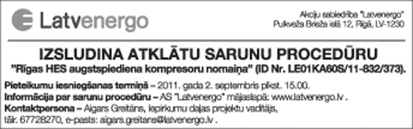 Konkursa piedāvājumu atvēršana notiks 2011.gada 31.augustā plkst. 10.00 Rīgā, Gogoļa ielā 3, 301.kabinetā.