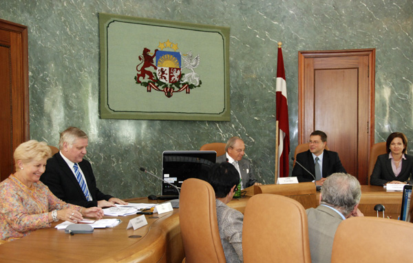| Vakar, 11.augustā, Valdības namā notika Nacionālās trīspusējās sadarbības padomes sēde, kurā kopā ar citiem padomes locekļiem piedalījās (attēlā no labās) labklājības ministre Ilona Jurševska, Ministru prezidents Valdis Dombrovskis, Latvijas Darba devēju konfederācijas prezidents Vitālijs Gavrilovs, Latvijas Brīvo arodbiedrību savienības priekšsēdētājs Pēteris Krīgers un priekšsēdētāja vietniece Līvija Marcinkēviča Foto: VK |