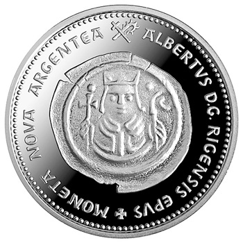 Latvijas Bankas jubilejas monētas ir miniatūri mākslas darbi, ko velta Latvijas vērtībām – notikumiem, panākumiem, cilvēkiem, mūsu kultūras zīmēm. Atzīmējot Rīgas naudas astoņsimtgadi, ir nokalta monēta monētā – bīskapa Alberta feniņš sudraba latā. Rīga savu neatkarību apliecināja 1211.gadā, kad bīskaps Alberts Gotlandes tirgotājiem piešķīra privilēģiju kalt monētas Rīgas bīskapijā. Rīgas HES būvniecības sākumā veiktajos arheoloģiskajos izrakumos, ko vadīja Ēvalds Mugurēvičs un Anna Zariņa, Mārtiņsalas pilī 1968.gadā tika atsegts pavards, kurā zem akmeņiem atradās 20 vienādas monētas, kuru tips pētniekiem nebija zināms. Vēlākie pētījumi pierādīja šo monētu piederību Rīgas bīskapijai.
