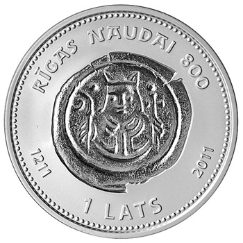 Monētas priekšpuse (averss): Centrā uz gluda fona bīskapa Alberta (1198–1229) laikā kaltā feniņa attēls: bīskaps ar mitru galvā pretskatā, labajā rokā – krusts, kreisajā – bīskapa zizlis, virs krusta un zižļa – lodīte. Attēlam apkārt – uzraksts RĪGAS NAUDAI 800 un gadskaitļi 1211 un 2011, lejasdaļā – uzraksts 1 LATS, gar monētas malu – pērļu josla. |