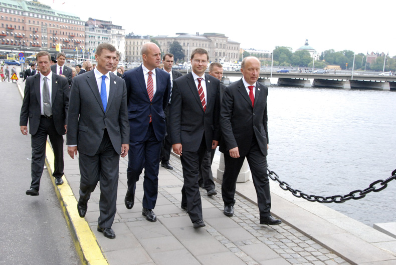 Vakar, 15.augustā, Ministru prezidents Valdis Dombrovskis uzturējās darba vizītē Zviedrijas Karalistes galvaspilsētā Stokholmā, kur kopā ar Lietuvas, Igaunijas un Zviedrijas valdību vadītājiem piedalījās Baltijas gada ietvaros rīkotajos svinīgajos pasākumos, kas veltīti triju Baltijas valstu neatkarības atjaunošanas 20.gadskārtai. Pasākuma centrālais notikums norisinājās Normalmes laukumā, kur Baltijas valstu un Zviedrijas premjeri teica svinīgās runas. Pēc šā pasākuma valdību vadītāji (attēlā no labās) – Lietuvas premjerministrs Andrjus Kubiļus, Latvijas Ministru prezidents Valdis Dombrovskis, Zviedrijas premjerministrs Frederiks Reinfelts un Igaunijas premjerministrs Andruss Ansips – devās uz Zviedrijas parlamentu (Riksdāgu), kur svinīgi tika pacelti Latvijas, Lietuvas, Igaunijas un Zviedrijas karogi Foto: VK |
