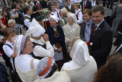 Latvijas Ministru prezidents Valdis Dombrovskis, sakot uzrunu stokholmiešiem Normalmes laukumā un sarunājoties ar Stokholmas latviešu koristiem Foto: VK |