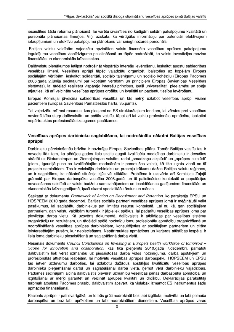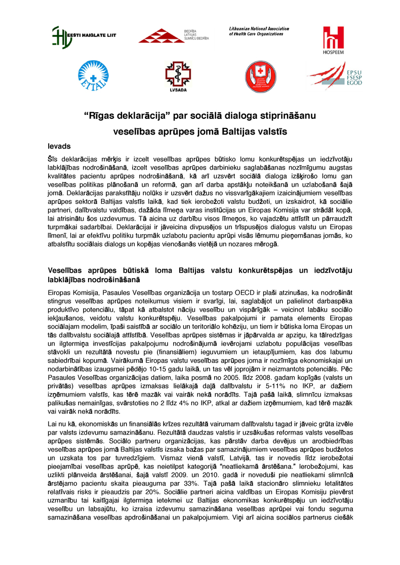 Deklarācija tika pieņemta starptautiskā konferencē, kas notika Rīgā 26. maijā. Konferenci rīkoja Eiropas Slimnīcu organizācija un Eiropas Sabiedrisko pakalpojumu arodbiedrību federācija ar oficiālu Eiropas Komisijas atbalstu. Pilnu deklarācijas tekstu var skatīt zemāk.