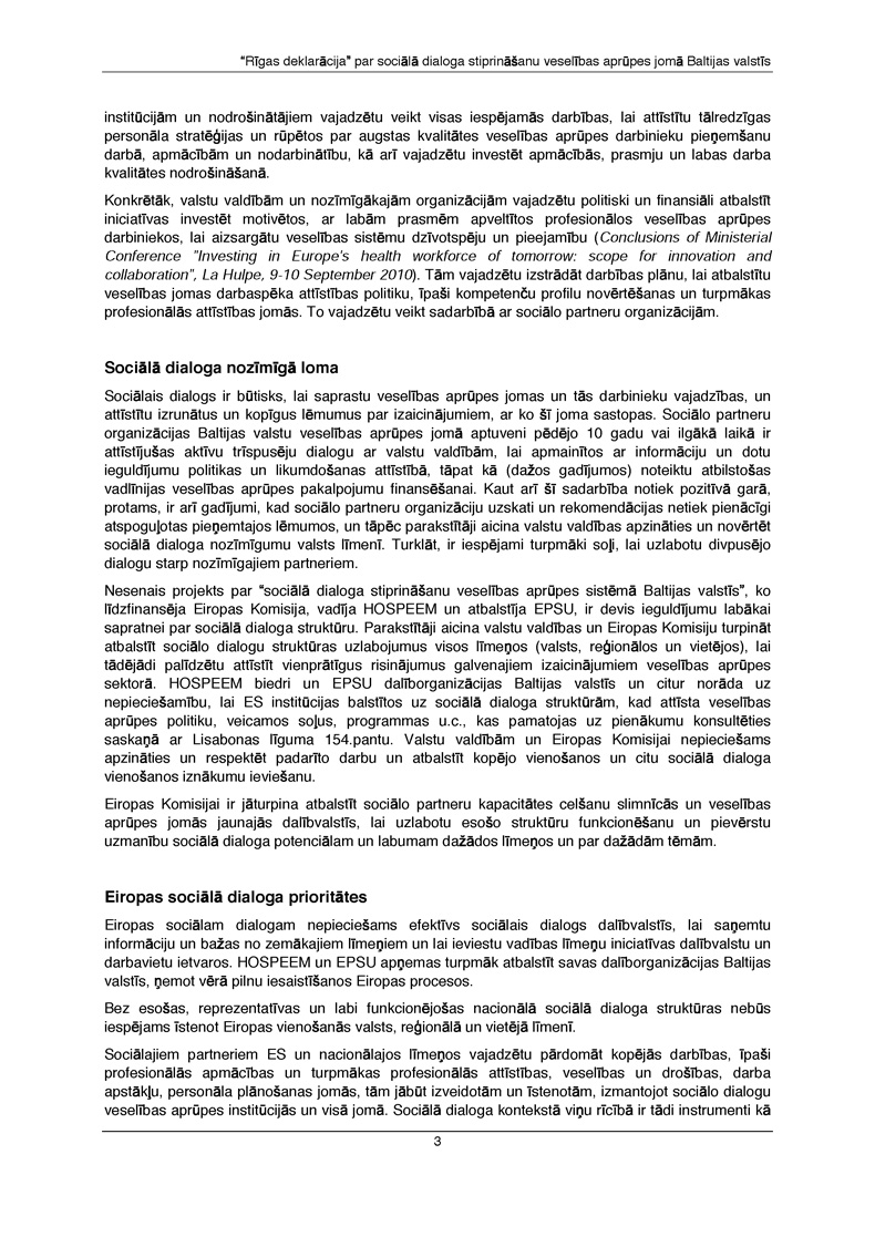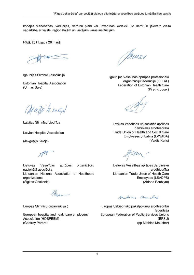 11. augustā Nacionālās trīspusējās sadarbības padomes (NTSP) sēdē Latvijas Veselības un sociālās aprūpes darbinieku arodbiedrības priekšsēdētājs Valdis Keris un Latvijas Slimnīcu biedrības priekšsēdētājs Jevgeņijs Kalējs kopīgi iesniedza valdībai un sociālajiem partneriem "Rīgas deklarāciju" par sociālā dialoga stiprināšanu veselības aprūpes jomā Baltijas valstīs.