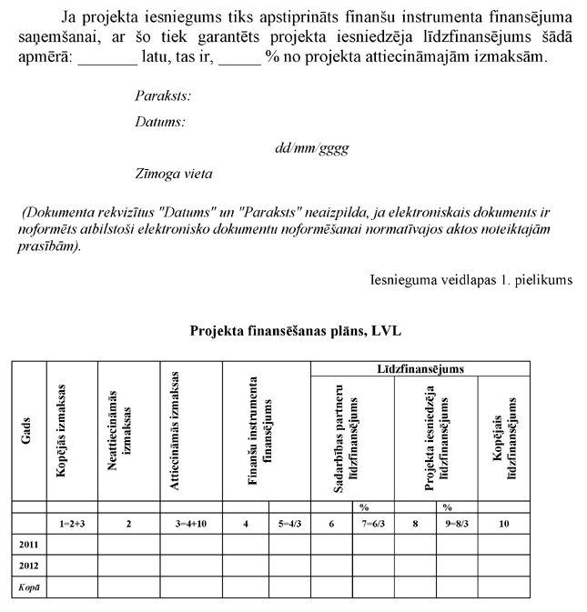| 4.1.1. | projekta iesniedzēja apliecinājums par projektam nepieciešamā līdzfinansējuma nodrošināšanu, norādot juridisku vai fizisku personu, kurai naudas aizdevums pieprasīts. Ja projekta līdzfinansējumu nodrošina fiziska vai juridiska persona, kura nav kredītiestāde vai krājaizdevumu sabiedrība, projekta iesniedzējs iesniedz dokumentus, kas pierāda, ka līdzfinansētāja rīcībā ir projekta līdzfinansēšanai nepieciešamais līdzekļu apjoms | P | |||