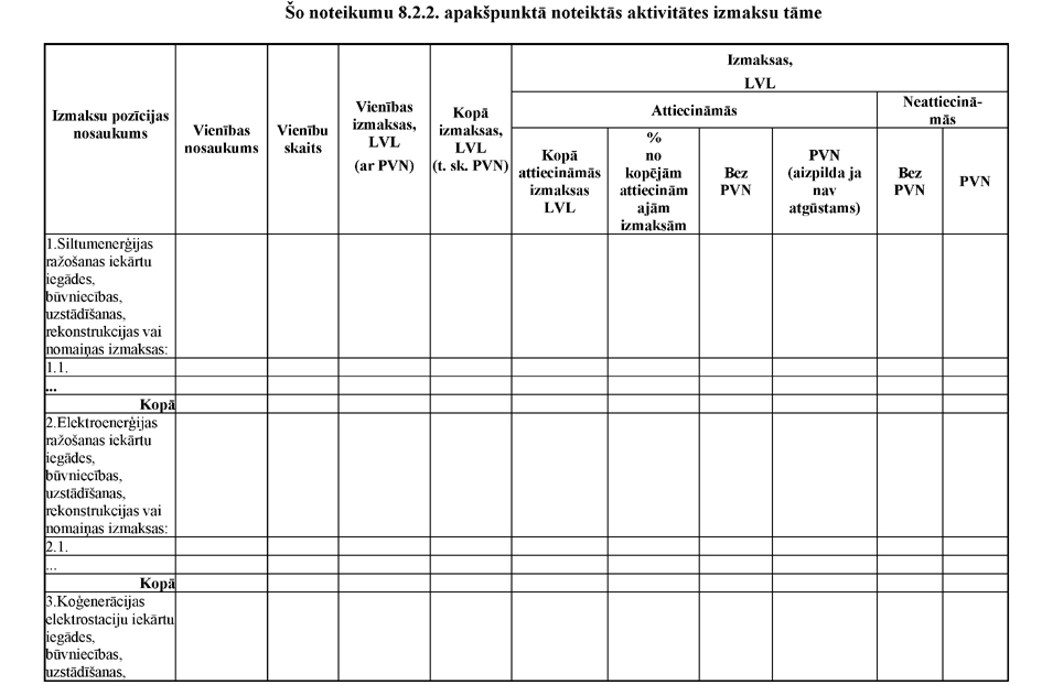 8.2.2. papildu ieguldījumu veikšana atjaunojamo enerģijas resursu veicināšanai. Šādā gadījumā komersantiem attiecināmās izmaksas aprēķina atbilstoši šo noteikumu 1.pielikuma II nodaļai;