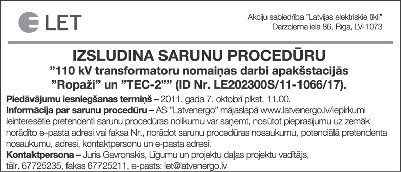 Piedāvājumu iesniegšanas termiņš 2011.gada 3.novembris.