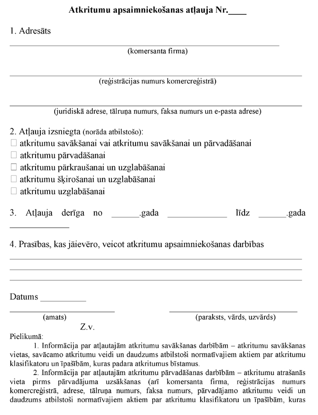 1.3. atļaujas veidlapas paraugu atkritumu savākšanai, pārvadāšanai, pārkraušanai, šķirošanai vai uzglabāšanai;
