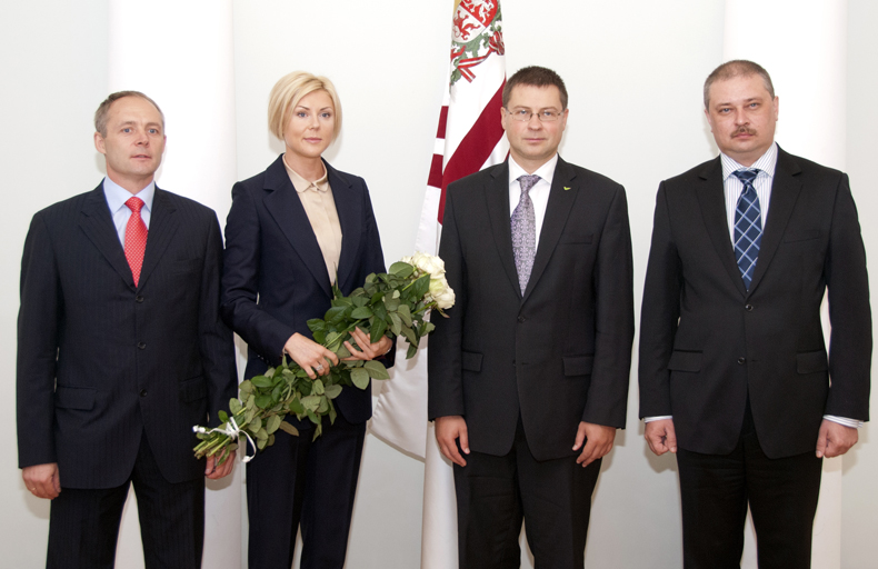 Vakar, 15.septembrī, Ministru prezidents Valdis Dombrovskis pasniedza pateicības rakstu vieglatlētei Inetai Radēvičai par iegūto godpilno bronzas medaļu Pasaules vieglatlētikas čempionātā Dienvidkorejā. Latvijas vieglatlēte Ineta Radēviča 28.augustā ar 6,76 metrus tālu lēcienu sestajā, pēdējā mēģinājumā ierindojās 3.vietā. Pasaules čempionāti vieglatlētikā notiek kopš 1983.gada, un tos rīko katru otro gadu. Līdz šim vienīgo reizi pasaules čempionātos Latvijas vieglatlēts uz goda pjedestāla kāpa 1983.gadā, kad PSRS komandā startējušais Dainis Kūla izcīnīja bronzu šķēpa mešanā. Attēlā (no kreisās): Latvijas Vieglatlētikas savienības prezidents Guntis Zālītis, vieglatlēte Ineta Radēviča, Ministru prezidents Valdis Dombrovskis un izglītības un zinātnes ministrs Rolands Broks Foto:VPK |