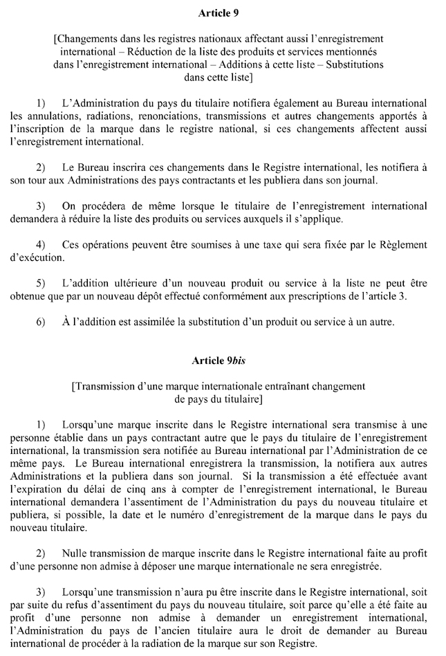 Article 9: Changes in National Registers also Affecting International Registration. Reduction of List of Goods and Services Mentioned in International Registration. Additions to that List. Substitutions in that List
