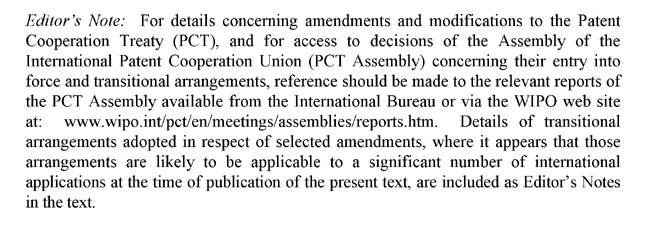 1. Ja nolīgumā ar Starptautisko patentmeklējumu iestādi vai Starptautiskās pirmējās ekspertīzes iestādi ir paredzēti pārejas noteikumi, kas ierobežo to starptautisko pieteikumu skaitu vai veidus, kurus šī iestāde apņemas izskatīt, Asambleja veic pasākumus, kas vajadzīgi, lai pakāpeniski piemērotu šo līgumu un Reglamentu attiecībā uz šiem starptautisko pieteikumu veidiem. Šo noteikumu piemēro arī lūgumiem veikt starptautiskā tipa patentmeklējumus saskaņā ar 15. panta 5. punktu.