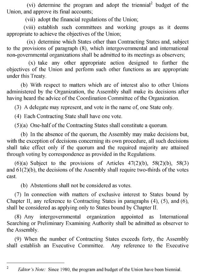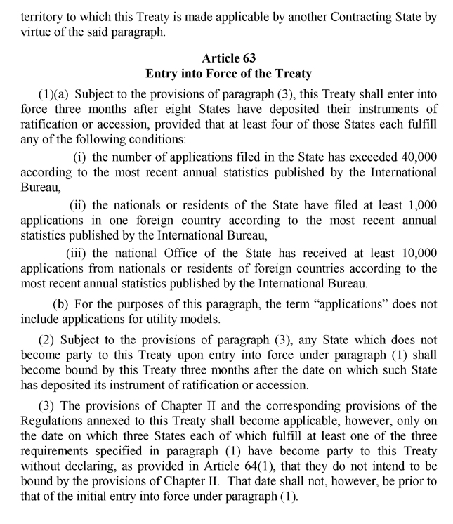 2. Asambleja nosaka datumus, no kuriem saskaņā ar 1. punktu var iesniegt starptautiskos pieteikumus un pieprasījumus veikt starptautisko pirmējo ekspertīzi. Šie datumi nevar tikt noteikti vēlāk kā sešus mēnešus pēc Līguma stāšanās spēkā saskaņā ar 63. panta 1. punktu vai pēc datuma, kad kļūst saistoši II nodaļas noteikumi saskaņā ar 63. panta 3. punktu.
