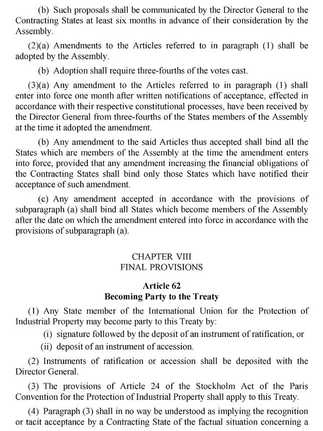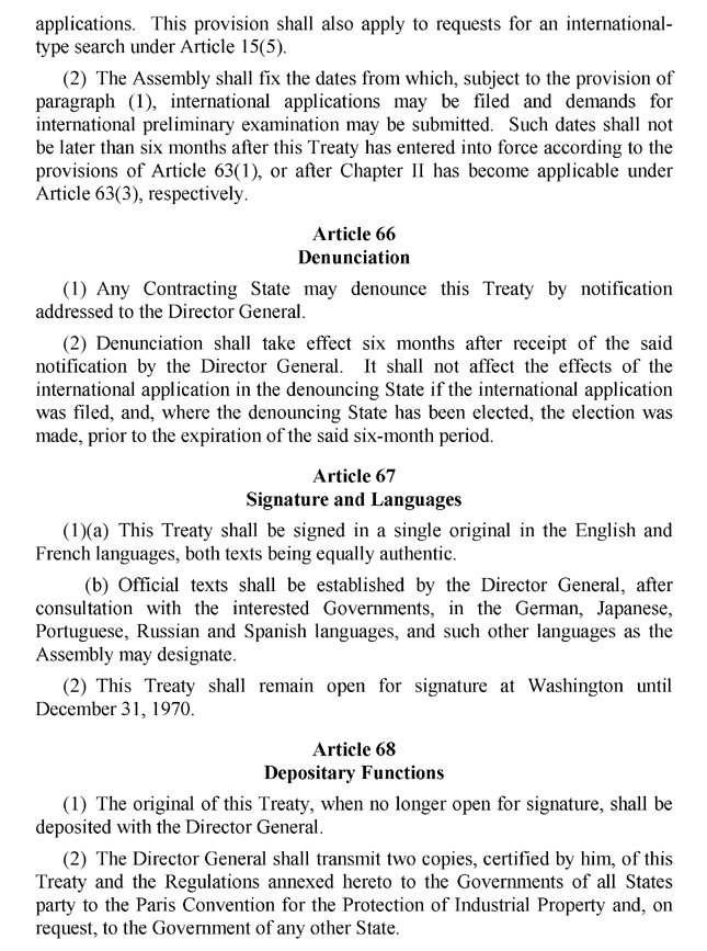 2. Denonsēšana stājas spēkā pēc sešiem mēnešiem pēc datuma, kad ģenerāldirektors ir saņēmis minēto paziņojumu. Tas neskar starptautiskā pieteikuma tiesiskās sekas valstī, kura denonsē līgumu, ja starptautiskais pieteikums bijis iesniegts un – ja šī valsts ir bijusi izraudzītā valsts – izraudzīšana ir notikusi pirms minētā sešu mēnešu termiņa izbeigšanās.