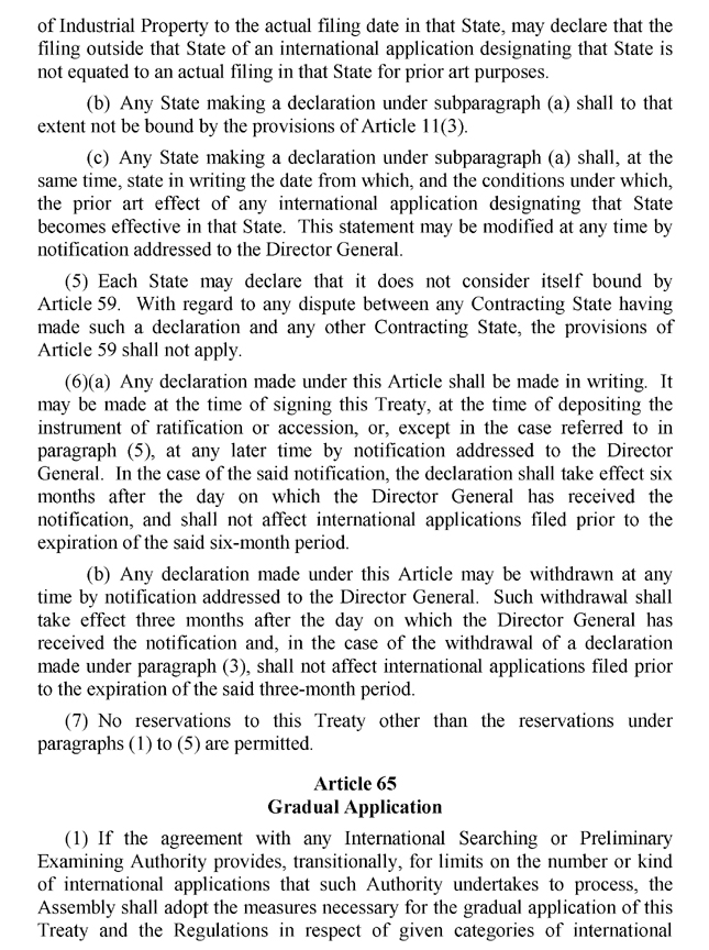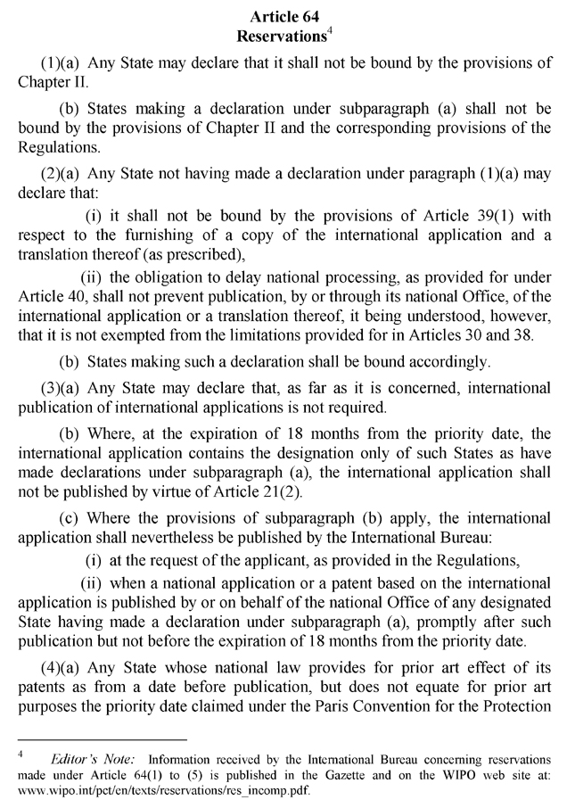 4. a) Katra valsts, kuras tiesību akti paredz, ka tās patenti atbilst zināmajam tehnikas līmenim no datuma pirms publikācijas, bet zināmā tehnikas līmeņa nolūkā nepielīdzina prioritātes datumu, kas pieprasīts saskaņā ar Parīzes Konvenciju par rūpnieciskā īpašuma aizsardzību, pieteikuma faktiskajam datumam šajā valstī, var deklarēt, ka tāda starptautiskā pieteikuma iesniegšana ārpus šīs valsts, kurā ir norādīta šī valsts, nav pielīdzināma faktiskajai iesniegšanai šajā valstī zināmā tehnikas līmeņa vajadzībām.