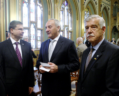 Vakar, 28.septembrī, Rīgā, Mazajā ģildē: Ministru prezidents Valdis Dombrovskis, Pasaules brīvo latviešu apvienības valdes priekšsēdis Ints Rupners, Valsts prezidents Andris Bērziņš (otrajā rindā centrā) kopā ar PBLA valdes locekļiem Foto: VPK