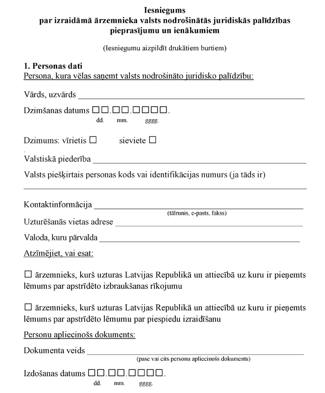 1. Noteikumi nosaka izraidāmā ārzemnieka iesnieguma par valsts nodrošinātās juridiskās palīdzības pieprasījumu un ienākumiem veidlapas paraugu (pielikums).