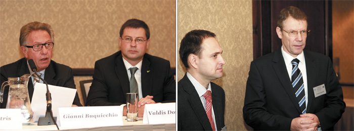 Piedaloties konferencē (attēlos no kreisās): Venēcijas komisijas prezidents Džanni Bukvikjo un Ministru prezidents Valdis Dombrovskis; Rīgas Juridiskās augstskolas prorektors Mārtiņš Mits un Saeimas Juridiskā biroja vadītājs Gunārs Kusiņš Par konferenci arī žurnālā "Jurista Vārds" – 04.10.2011. Foto: Māris Kaparkalējs, "LV"