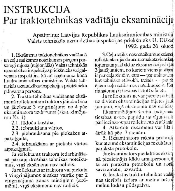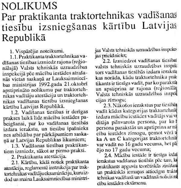 Apstiprināt nolikumu par praktikanta traktortehnikas vadīšanas tiesību izsniegšanas kārtību Latvijas Republikā.