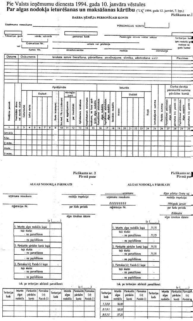 Algas nodokļa ieturēšanas un maksāšanas kārtība (Pielikumi). Publicēts oficiālajā laikrakstā "Latvijas Vēstnesis", 20.01.1994., Nr. 8 https://www.vestnesis.lv/ta/id/237111