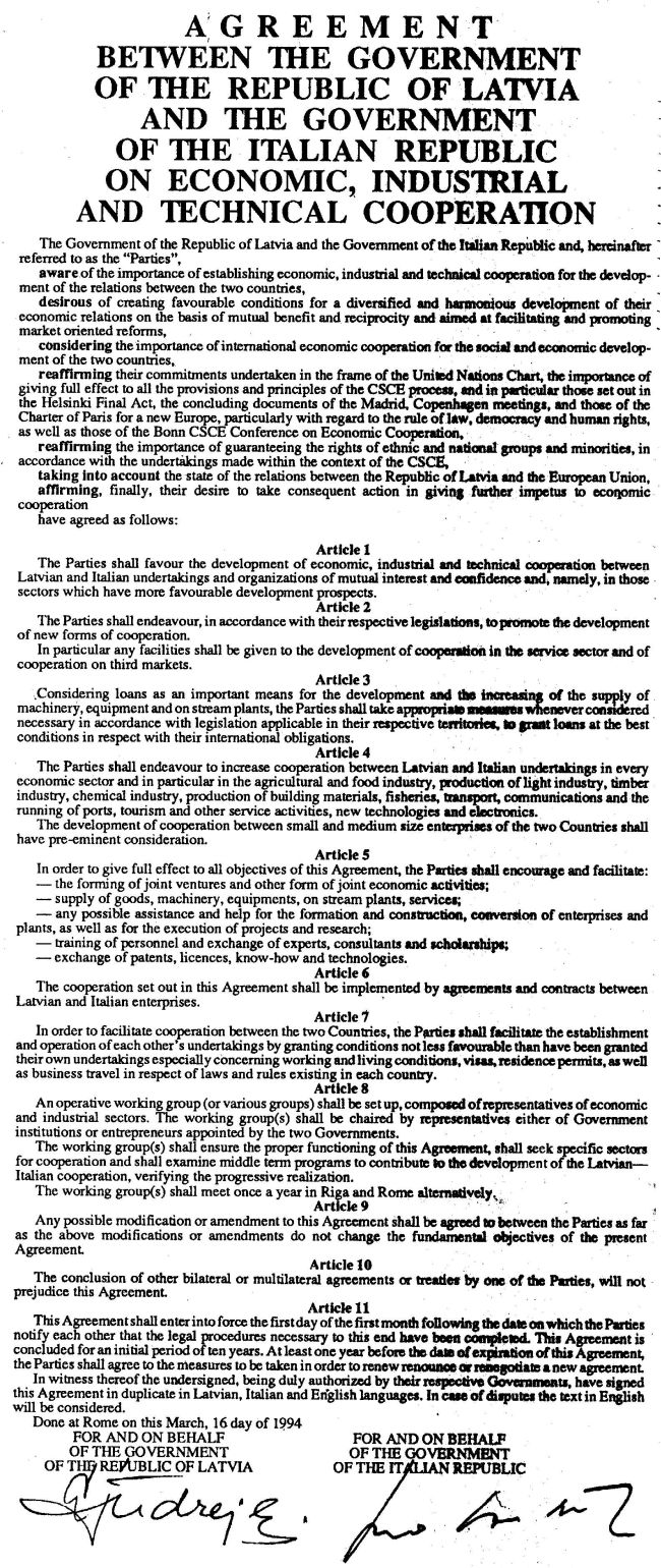 AGREEMENT BETWEEN THE GOVERNMENT OF THE REPUBLIC OF LATVIA AND THE GOVERNMENT OF THE ITALIAN REPUBLIC ON ECONOMIC, INDUSTRIAL AND TECHNICAL COOPERATION. Publicēts oficiālajā laikrakstā "Latvijas Vēstnesis", 23.03.1994., Nr. 36 https://www.vestnesis.lv/ta/id/237116-agreement-between-the-government-of-the-republic-of-latvia-and-the-government-of-the-italian-republic-on-economic-industrial-an...