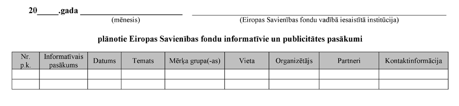 6.2. plāno un īsteno citus informatīvos un publicitātes pasākumus un reizi mēnesī līdz divdesmit piektajam datumam elektroniski nosūta vadošajai iestādei informāciju par nākamajā mēnesī plānotajiem informatīvajiem un publicitātes pasākumiem (1.pielikums).