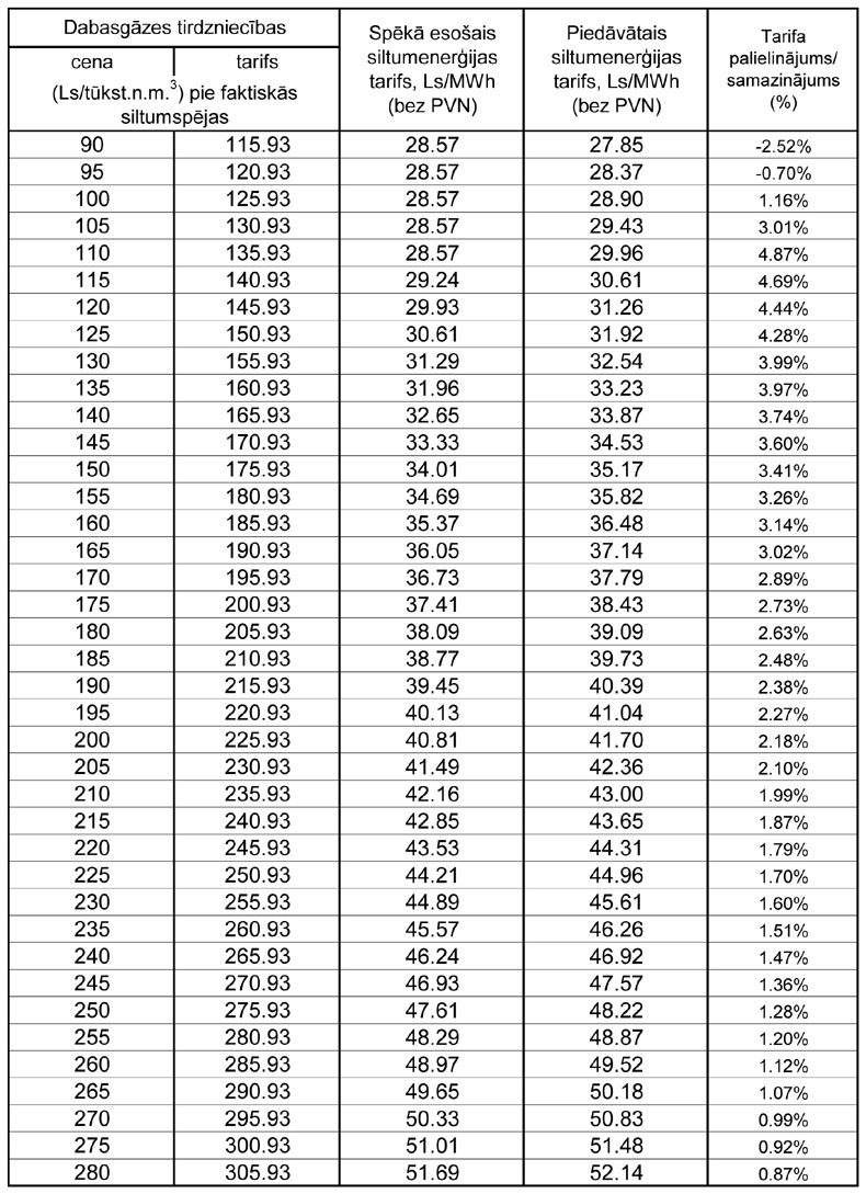 Piedāvātie siltumenerģijas tarifi (bez pievienotās vērtības nodokļa) atkarībā no dabasgāzes diferencētajiem tirdzniecības gala tarifiem pie dažādām dabasgāzes tirdzniecības cenām varētu stāties spēkā no 2012.gada 1.janvāra.