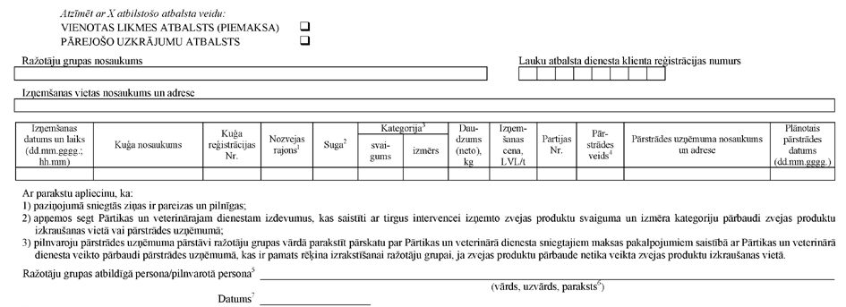 "11.1 Ražotāju grupa, kas pretendē uz šo noteikumu 2.2. vai 2.3.apakšpunktā minētajiem tirgus intervences atbalsta pasākumiem, Lauku atbalsta dienestā pirms Regulas Nr.2814/2000 7.panta 2.punktā un Regulas Nr.939/2001 8.panta 1.punktā minētā atbalsta pieprasījuma iesniegšanas par katru no tirgus izņemto zvejas produktu partiju iesniedz: