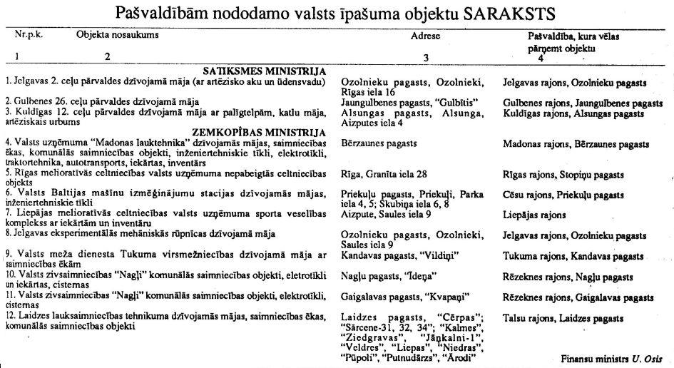 Pamatojoties uz Augstākās Padomes 1991. gada 20. marta lēmuma "Par valsts īpašumu un tā konversijas pamatprincipiem" 4. punktu, kā arī ņemot vērā ministriju un pašvaldību savstarpējo vienošanos, atļaut ministrijām - valsts īpašuma pārvaldītājām - nodot attiecīgo pašvaldību īpašumā valsts īpašuma objektus saskaņā ar pievienoto sarakstu.
