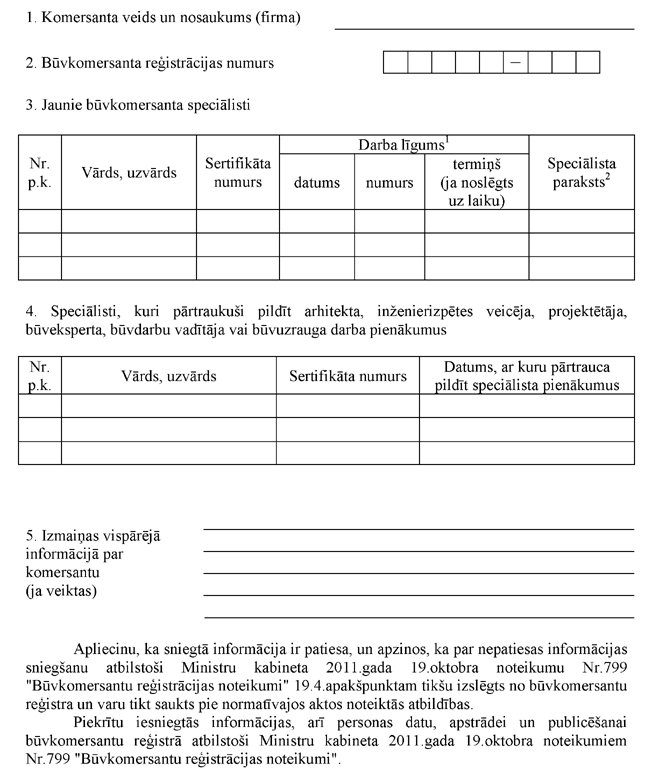 12.1. mainījušies reģistrā norādītie būvkomersanta speciālisti, iesniedzot iesniegumu par izmaiņām speciālistu sarakstā (3.pielikums);