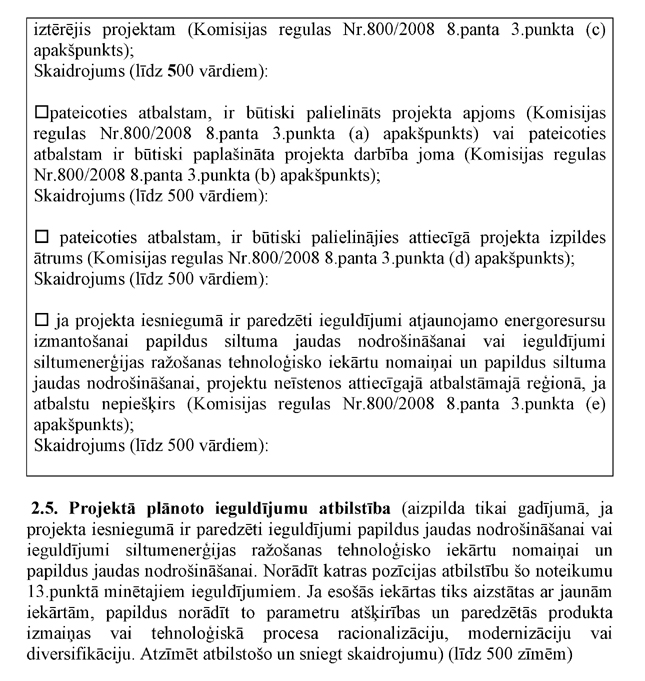 20. Ja projekta iesniegumā ir paredzēti ieguldījumi atjaunojamo energoresursu izmantošanai papildu siltuma jaudas nodrošināšanai vai ieguldījumi siltumenerģijas ražošanas tehnoloģisko iekārtu nomaiņai un papildu siltuma jaudas nodrošināšanai, ieguldījumi ir saistīti ar esoša uzņēmuma paplašināšanu, esoša uzņēmuma produkcijas daudzveidošanu ar jauniem papildu produktiem vai uzņēmuma vispārējā ražošanas procesa būtisku maiņu saskaņā ar Komisijas regulas Nr.800/2008 12.panta 1.punkta "a" apakšpunkta nosacījumiem.