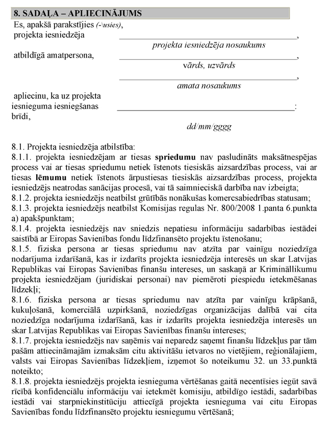 | 22. | Projekta iesniedzējs nav sodīts par Latvijas Administratīvo pārkāpumu kodeksa 189.2 panta trešajā daļā minēto administratīvo pārkāpumu vai tam nav piemēroti piespiedu ietekmēšanas līdzekļi par Krimināllikuma 280.panta otrajā daļā minētā noziedzīgā nodarījuma izdarīšanu |