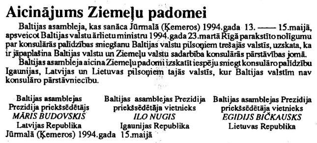 Aicinājums Ziemeļu padomei. Publicēts oficiālajā laikrakstā "Latvijas Vēstnesis", 17.05.1994., Nr. 58 https://www.vestnesis.lv/ta/id/238776
