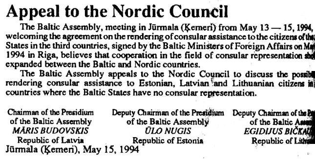 Appeal to the Nordic Council. Publicēts oficiālajā laikrakstā "Latvijas Vēstnesis", 17.05.1994., Nr. 58 https://www.vestnesis.lv/ta/id/238777