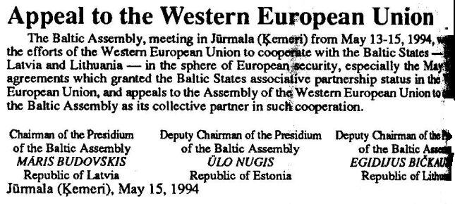 Appeal to the Western European Union. Publicēts oficiālajā laikrakstā "Latvijas Vēstnesis", 17.05.1994., Nr. 58 https://www.vestnesis.lv/ta/id/238779