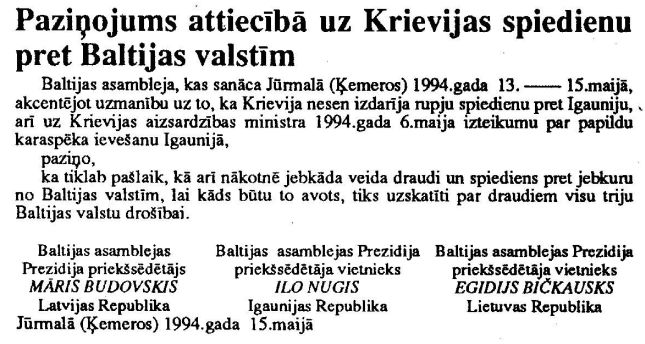 Paziņojums attiecībā uz Krievijas spiedienu pret Baltijas valstīm. Publicēts oficiālajā laikrakstā "Latvijas Vēstnesis", 17.05.1994., Nr. 58 https://www.vestnesis.lv/ta/id/238788-pazinojums-attieciba-uz-krievijas-spiedienu-pret-baltijas-valstim