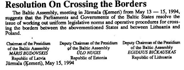 Resolution On Crossing the Borders. Publicēts oficiālajā laikrakstā "Latvijas Vēstnesis", 17.05.1994., Nr. 58 https://www.vestnesis.lv/ta/id/238790