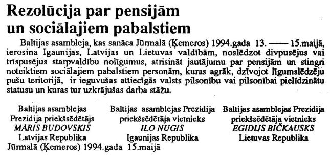 Rezolūcija par pensijām un sociālajiem pabalstiem. Publicēts oficiālajā laikrakstā "Latvijas Vēstnesis", 17.05.1994., Nr. 58 https://www.vestnesis.lv/ta/id/238791