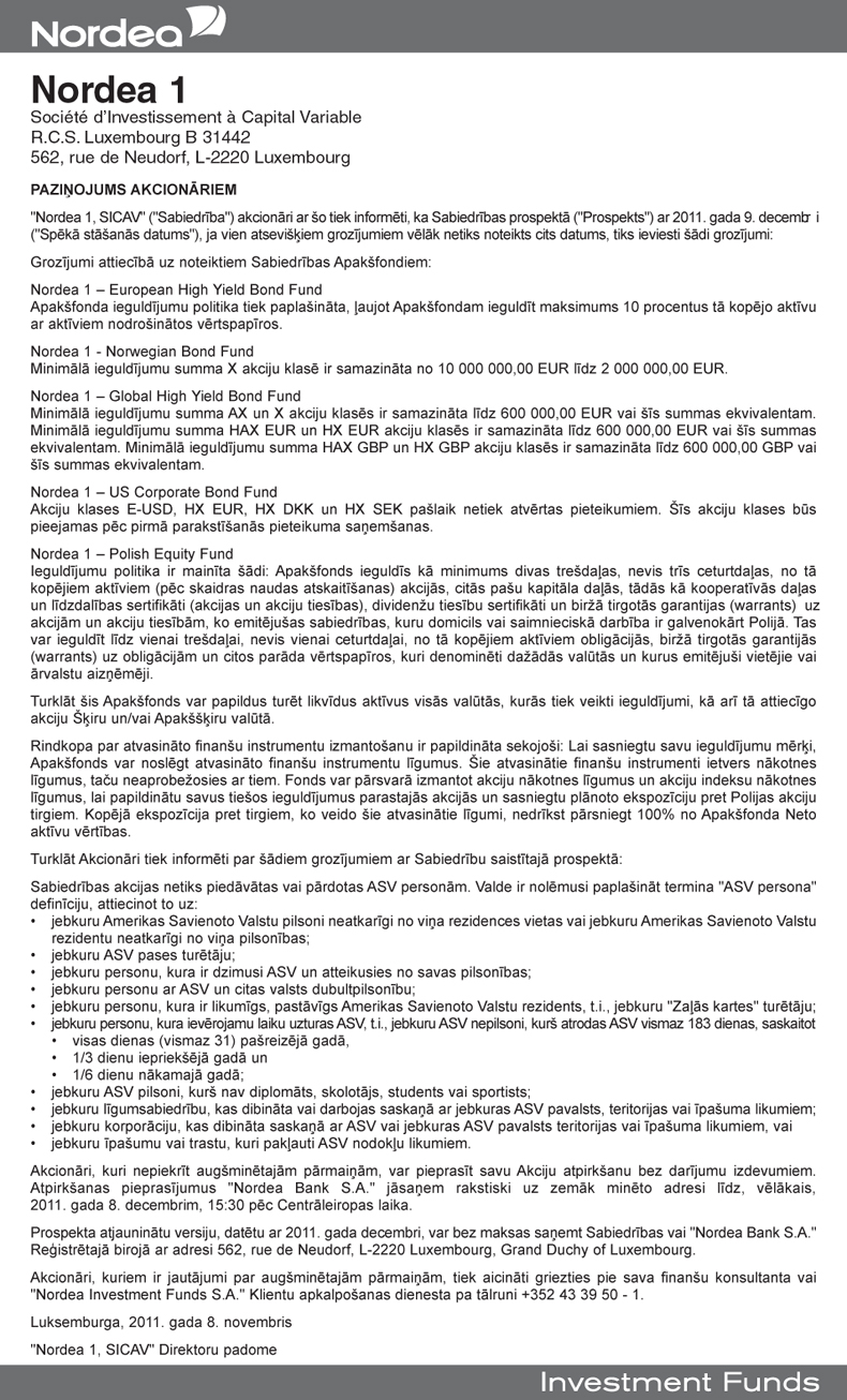 Paziņojumi akcionāriem, dalībniekiem, biedriem. Publicēts oficiālajā laikrakstā "Latvijas Vēstnesis", 8.11.2011., Nr. 176 https://www.vestnesis.lv/ta/id/239085