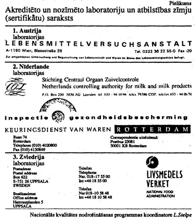 Apstiprināt pielikumā pievienoto akreditēto un nozīmēto laboratoriju un atbilstības zīmju (sertifikātu) sarakstu, kurš izstrādāts saskaņā ar Ministru kabineta 1994.gada 12.aprīļa noteikumiem Nr.87 (prot. nr.19 9) "Par pārtikas produktu un preču, parfimērijas izstrādājumu un rotaļlietu obligāto sertifikāciju" 9.punktu.