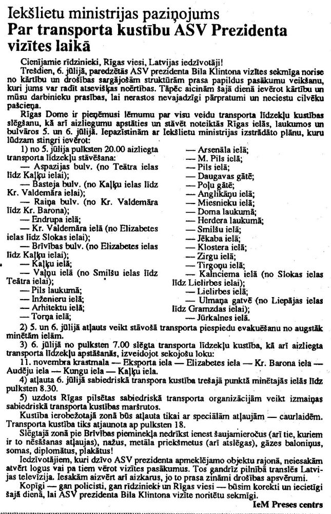 Iekšlietu ministrijas paziņojums "Par transporta kustību ASV Prezidenta vizītes laikā". Publicēts oficiālajā laikrakstā "Latvijas Vēstnesis", 5.07.1994., Nr. 77 https://www.vestnesis.lv/ta/id/239587