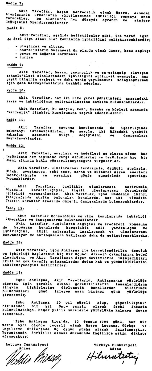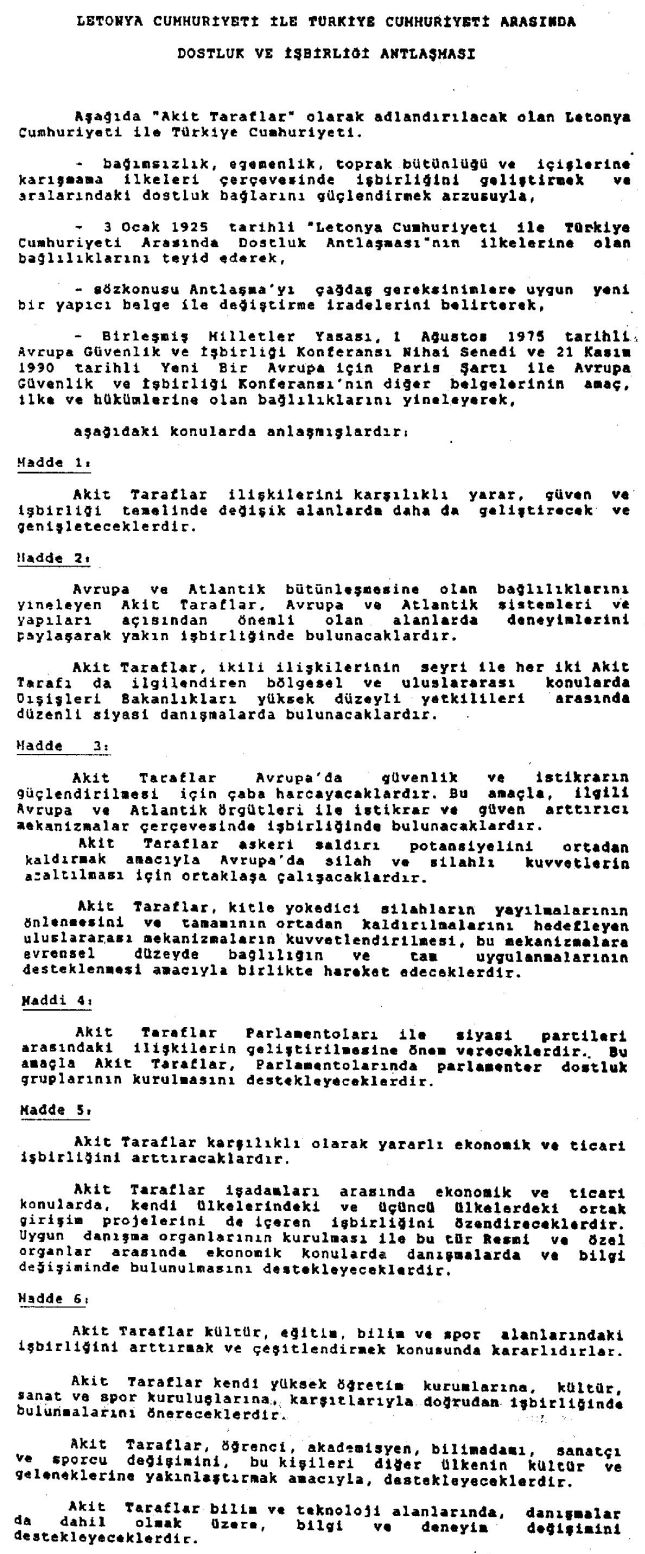 Latvijas Republikas un Turcijas Republikas draudzības un sadarbības līgums (Turku valodā). Publicēts oficiālajā laikrakstā "Latvijas Vēstnesis", 14.07.1994., Nr. 81 https://www.vestnesis.lv/ta/id/239602
