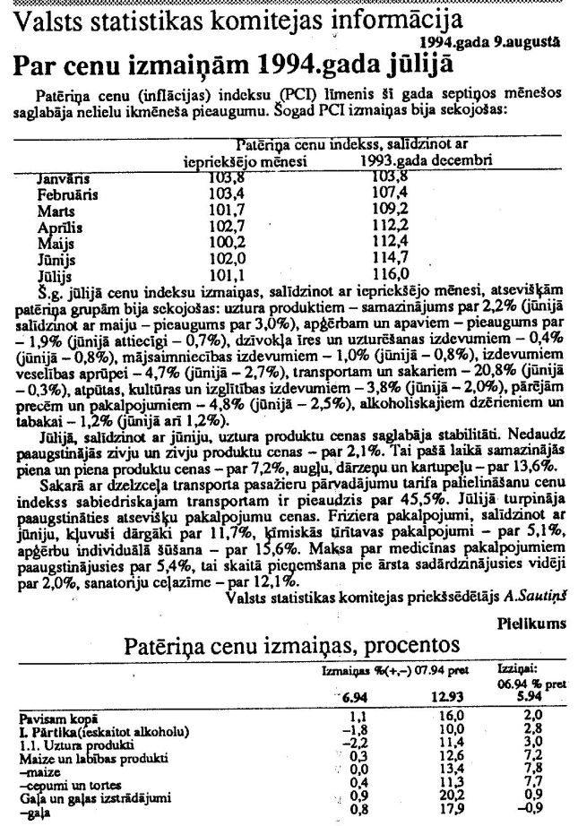 Par cenu izmaiņām 1994.gada jūlijā. Publicēts oficiālajā laikrakstā "Latvijas Vēstnesis", 16.08.1994., Nr. 95 https://www.vestnesis.lv/ta/id/239613