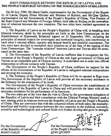 Latvijas Republikas un Ķīnas Tautas Republikas kopīgais komunikē par attiecību normalizēšanu (Angļu valodā). Publicēts oficiālajā laikrakstā "Latvijas Vēstnesis", 6.08.1994., Nr. 91 https://www.vestnesis.lv/ta/id/239749