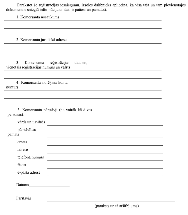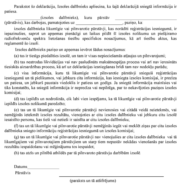15. Izsoles dalībnieks, lai varētu piedalīties izsolē, Izsoles komisijai iesniedz aizpildītu reģistrācijas iesnieguma (2.pielikums) oriģinālu, ko paraksta Pārstāvis. Reģistrācijas iesnieguma veidlapa elektroniski ir pieejama Regulatora mājas lapā internetā – http://www.sprk.gov.lv.
