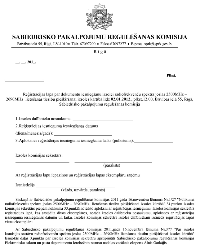 33. Pārstāvis reģistrācijas iesniegumu un pilnvaru (4.pielikums), uzrādot personu apliecinošu dokumentu, iesniedz Regulatora telpās, aizvērtā aploksnē (turpmāk – Aploksne) personīgi Izsoles komisijas sekretāram tādā veidā, lai Izsoles komisija to saņemtu līdz 2012.gada 2.janvārim plkst.12.00 (pēc Latvijas Republikas laika). Uz aploksnes norāda "Izsolei radiofrekvenču spektra joslas 2500MHz – 2690MHz lietošanas tiesību piešķiršanai" un Izsoles komisijas adresi, kā arī izsoles dalībnieka nosaukumu un juridisko adresi. Izsoles komisijas adrese – Sabiedrisko pakalpojumu regulēšanas komisija, Brīvības iela 55, Rīga, LV-1010, Latvija. Tālruņa numurs uzziņām: + 371 67097200. Regulators publicē laikrakstā "Latvijas Vēstnesis" paziņojumu par Izsoles komisijas adresi, ja tā mainās.