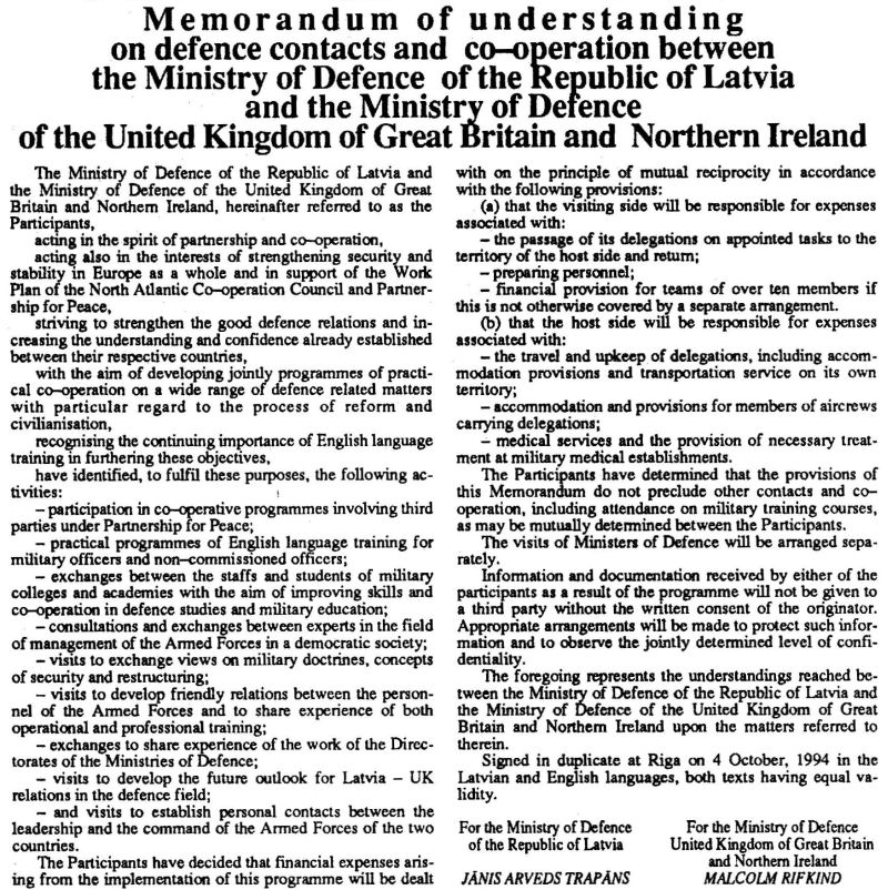 Memorandum of understanding on defence contacts and co-operation between the Ministry of Defence of the Republic of Latvia and the Ministry of Defence of the United KIngdom of Great Britain and Northern Ireland. Publicēts oficiālajā laikrakstā "Latvijas Vēstnesis", 6.10.1994., Nr. 117 https://www.vestnesis.lv/ta/id/240200