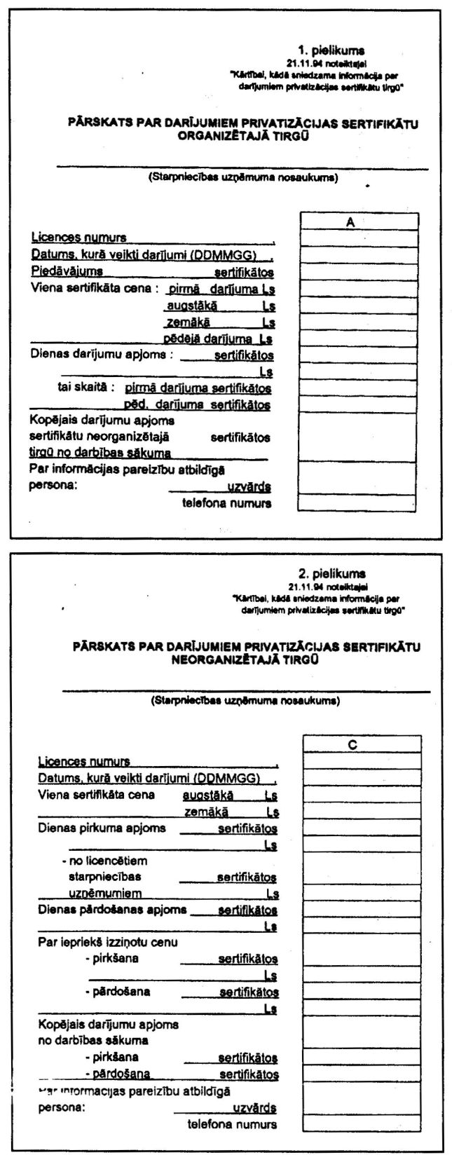 3.1. Informācijā iekļaujamas pievienotajā "Pārskatā par darījumiem privatizācijas sertifikātu organizētajā tirgū" (1.pielikums) un "Pārskatā par darījumiem privatizācijas sertifikātu neorganizētajā tirgū" (2.pielikums) prasītās ziņas par vienas dienas darījumiem. Par darījumu uzskatāms noslēgts pirkšanas - pārdošanas līgums (arī priekšlīgums un "cerību" līgums), ja tajā fiksēta cena un apjoms. Pārskatā uzrādāms arī starpniecības uzņēmuma (uzņēmējsabiedrības) veikto darījumu apjoms sertifikātu organizētajā un neorganizētajā tirgū no darbības sākuma.
