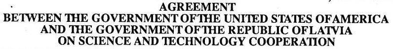 AGREEMENT BETWEEN THE GOVERNMENT OF THE UNITED STATES OF AMERICA AND THE GOVERNMENT OF THE REPUBLIC OF LATVIA ON SCIENCE AND TECHNOLOGY COOPERATION. Publicēts oficiālajā laikrakstā "Latvijas Vēstnesis", 7.07.1994., Nr. 78 https://www.vestnesis.lv/ta/id/240458