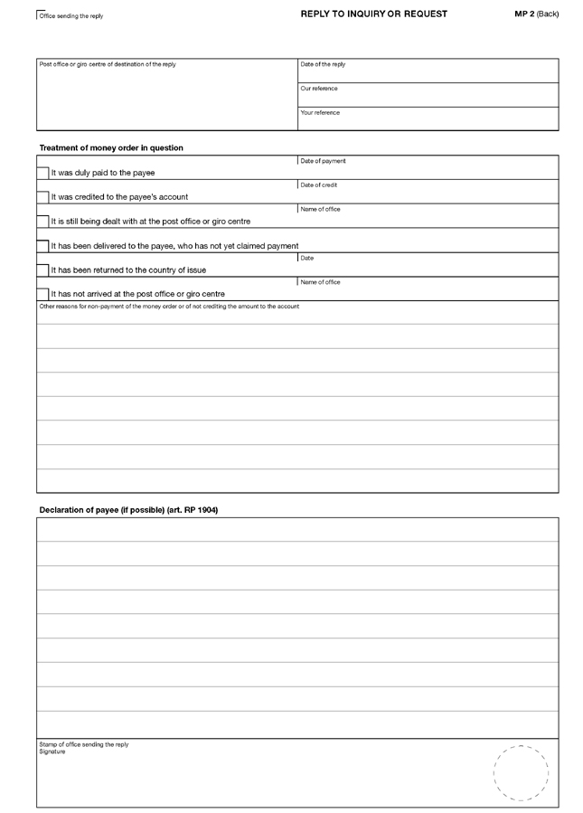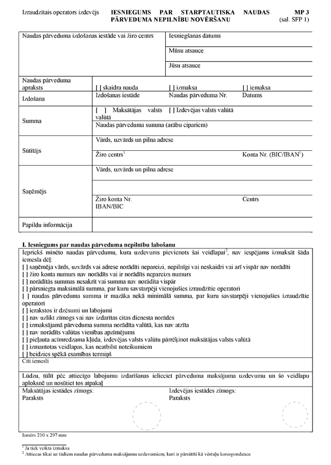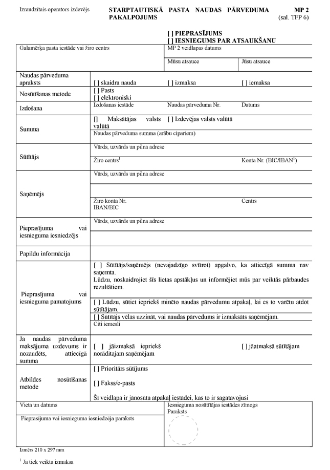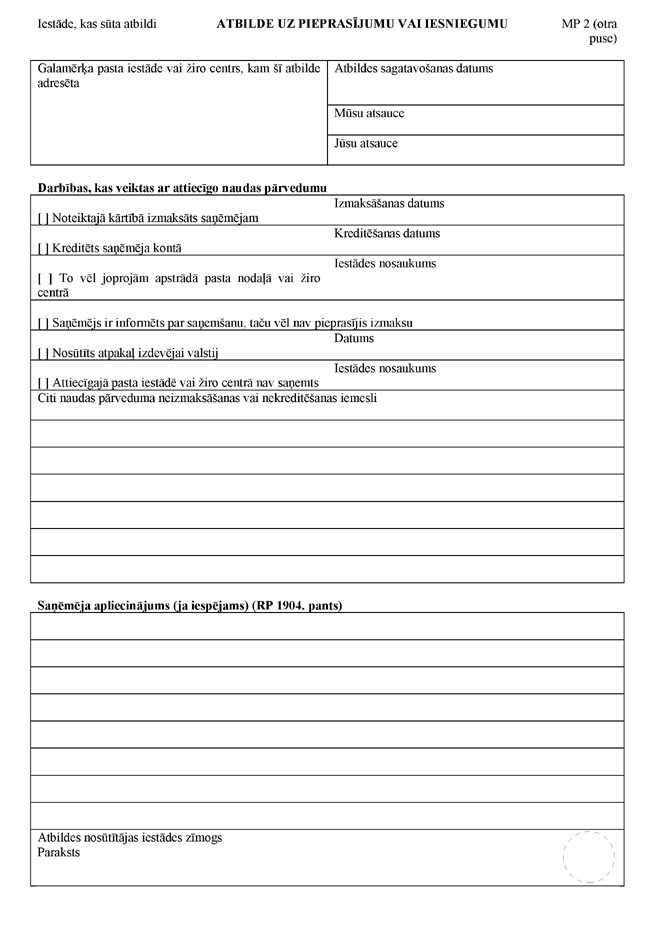 RP 1614 Procedūra, saskaņā ar kuru aizvieto naudas pārvedumu maksājumu uzdevumu, ko pārsūta kā vēstuļu korespondenci un kas pēc izmaksāšanas nozaudēts, pazudis vai iznīcināts